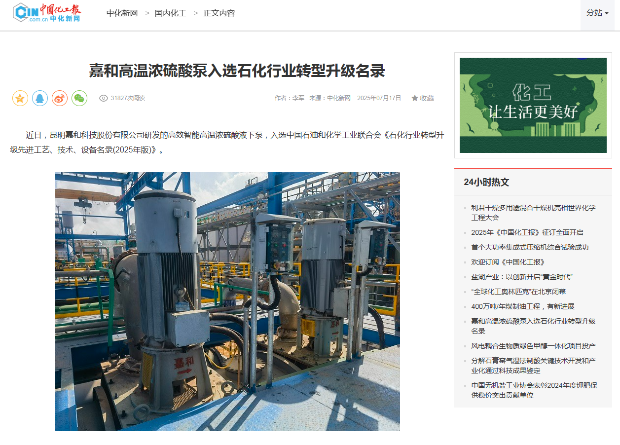 嘉和高溫濃硫酸泵入選石化行業轉型升級名錄