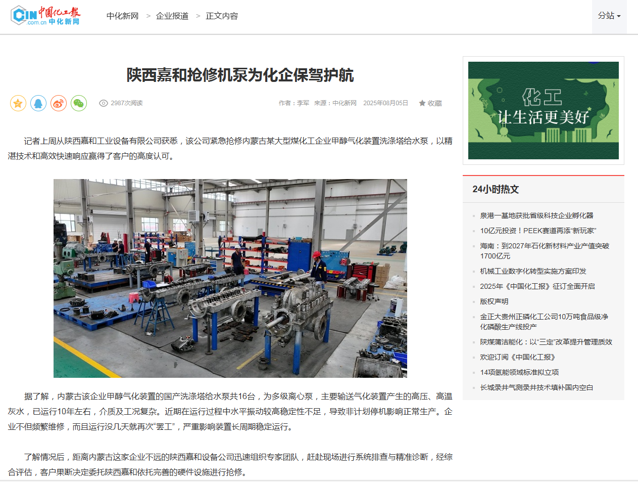 記者上周從陜西嘉和工業設備有限公司獲悉,該公司緊急搶修內蒙古某大型煤化工企業甲醇...