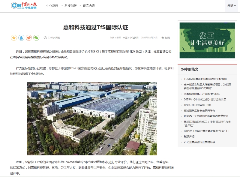 近日,昆明嘉和科技有限公司通過全球知名國際評價機構(gòu)TfS-(1(攜手實現(xiàn)可持續(xù)發(fā)展-化學(xué)聯(lián)盟)認(rèn)證,標(biāo)志著該公司在可持續(xù)發(fā)展與接軌國際高端市場取得突破。