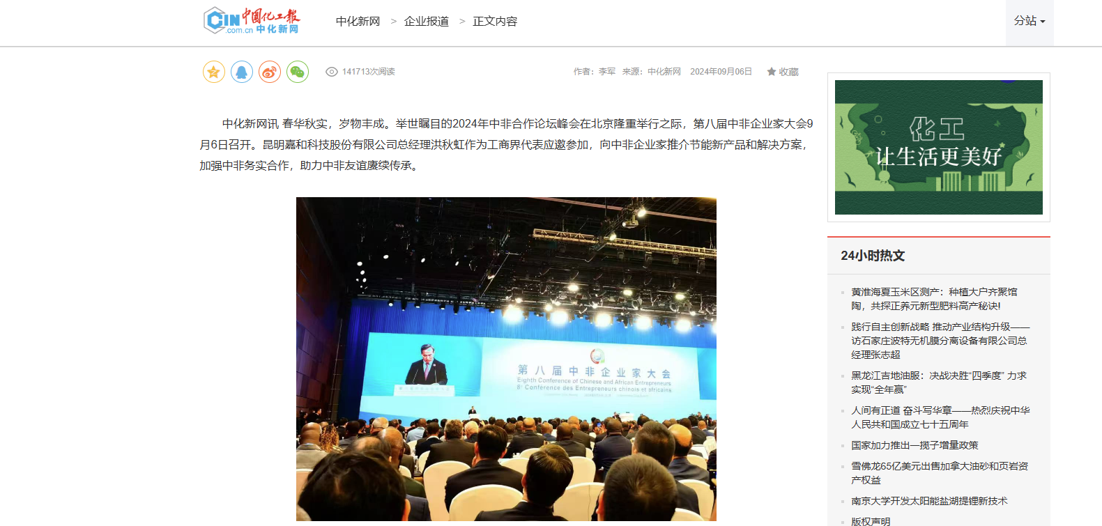 中化新網(wǎng)訊春華秋實,歲物豐成。舉世矚目的2024年中非合作論壇峰會在北京隆重舉行之際,第八屆中非企業(yè)家大會9月6日召開。昆明嘉和科技股份有限公司總經(jīng)理洪秋虹作為...