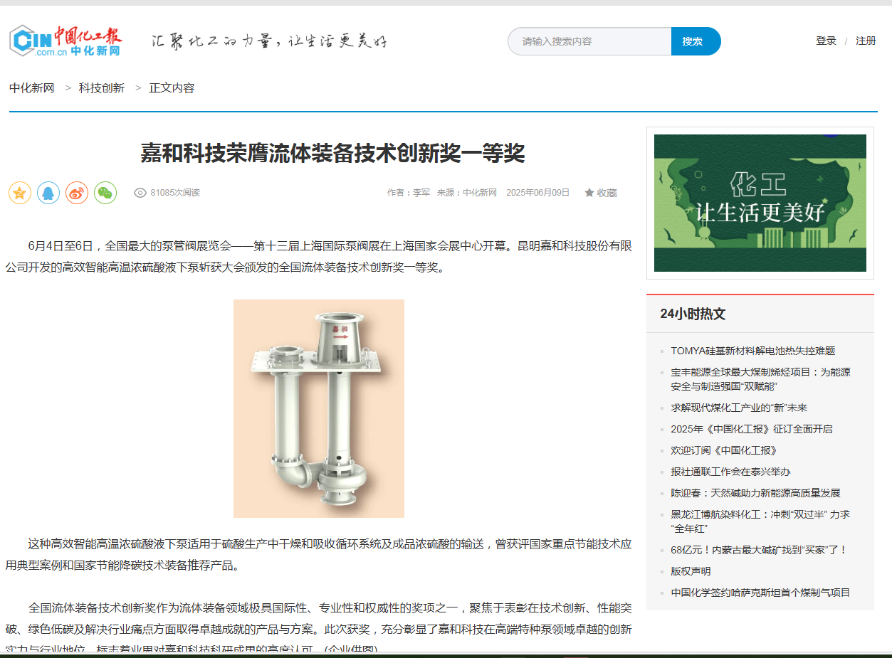 近日,昆明嘉和科技股份有限公司研發(fā)的高效智能高溫濃硫酸液下泵,入選中國石油和化學(xué)工業(yè)聯(lián)合會《石化行業(yè)轉(zhuǎn)型升級先進工藝、技術(shù)、設(shè)備名錄(2025年版)》。